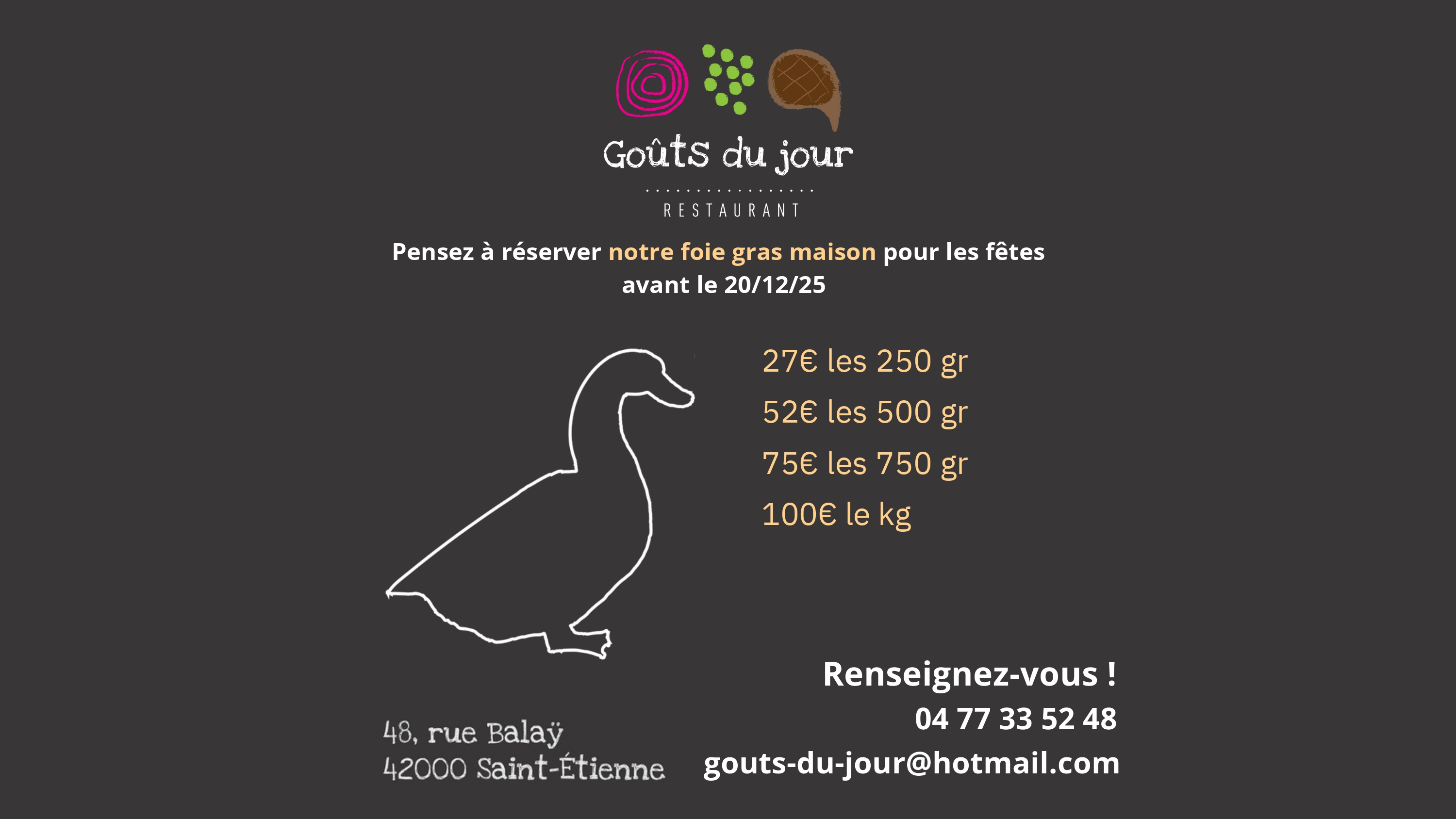 Les menus proposés tous les jours, sont élaborés selon les produits du marché....vous aurez le choix entre plusieurs entrées, plats et desserts, uniquement fait maison à base de produits frais.